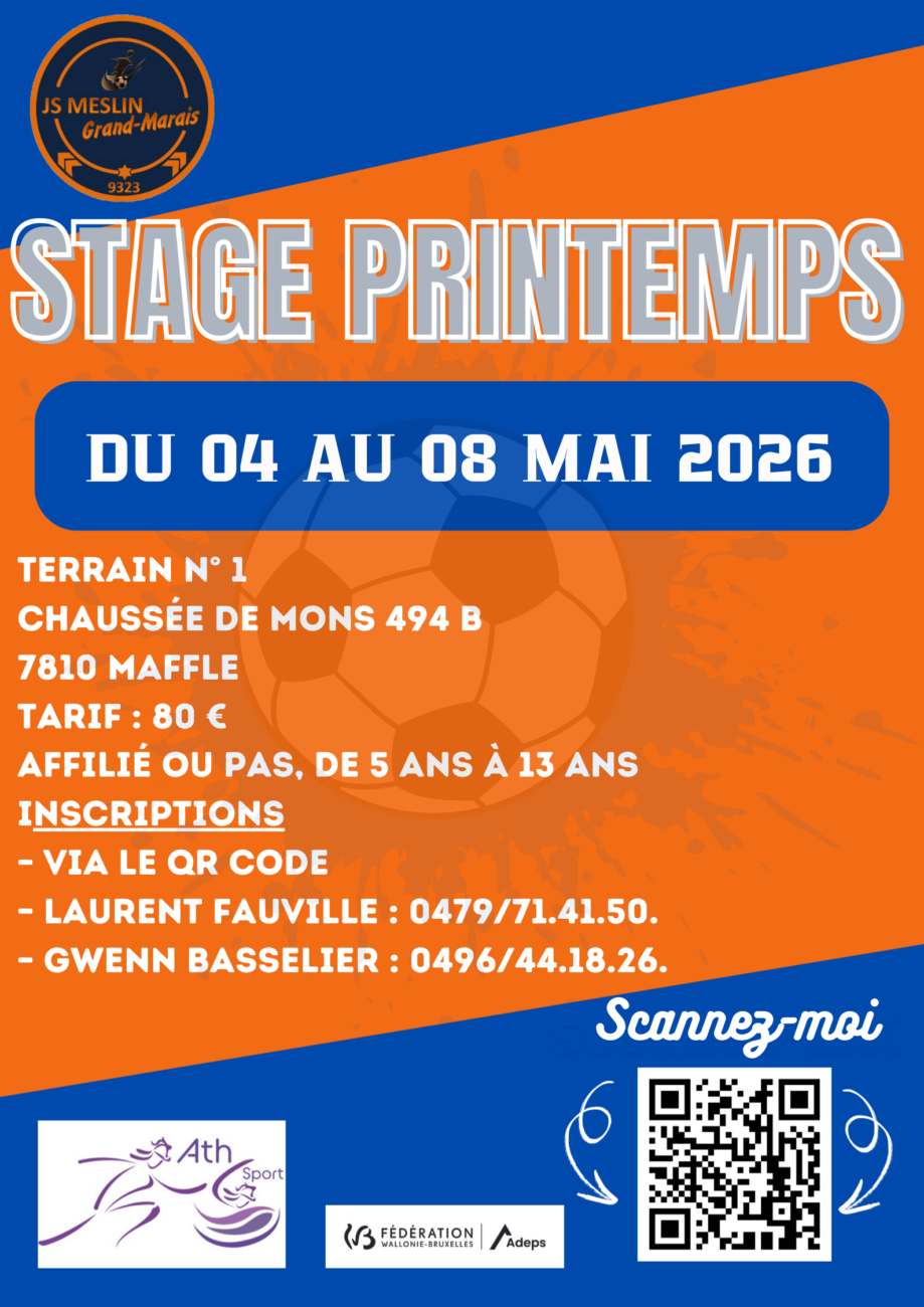 Sous le patronage de la Ville d’Ath et de l’ ADEPS, la JS Meslin GM organise un stage de printemps du 04 au 08 mai 2026 de 9h00′ à 16h00′.