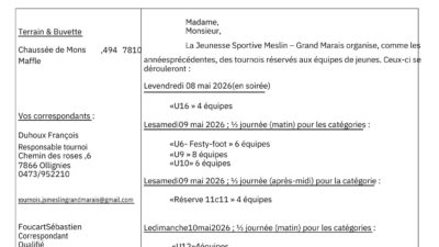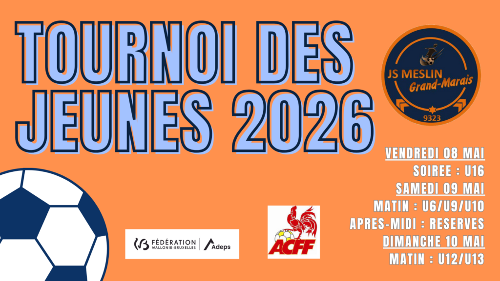 Comme chaque saison, la JS Meslin Grand Marais organise son tournoi annuel de football, qui se déroulera dans nos installations de Maffle, Chaussée d Mons – 7810 Maffle.