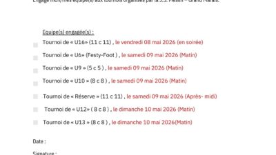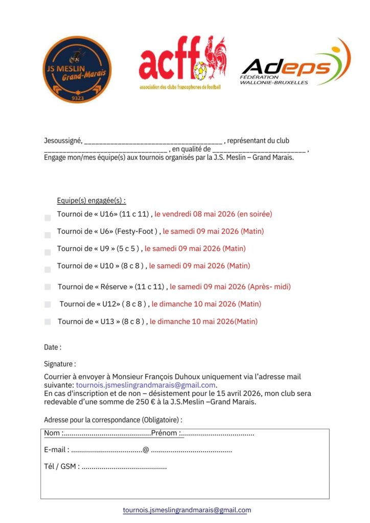Afin de valider votre inscription, nous vous remercions de bien vouloir compléter le bulletin d’inscription  et de nous le renvoyer dans les meilleurs délais à l’adresse mail suivante : tournois.jsmeslingrandmarais@gmail.com
